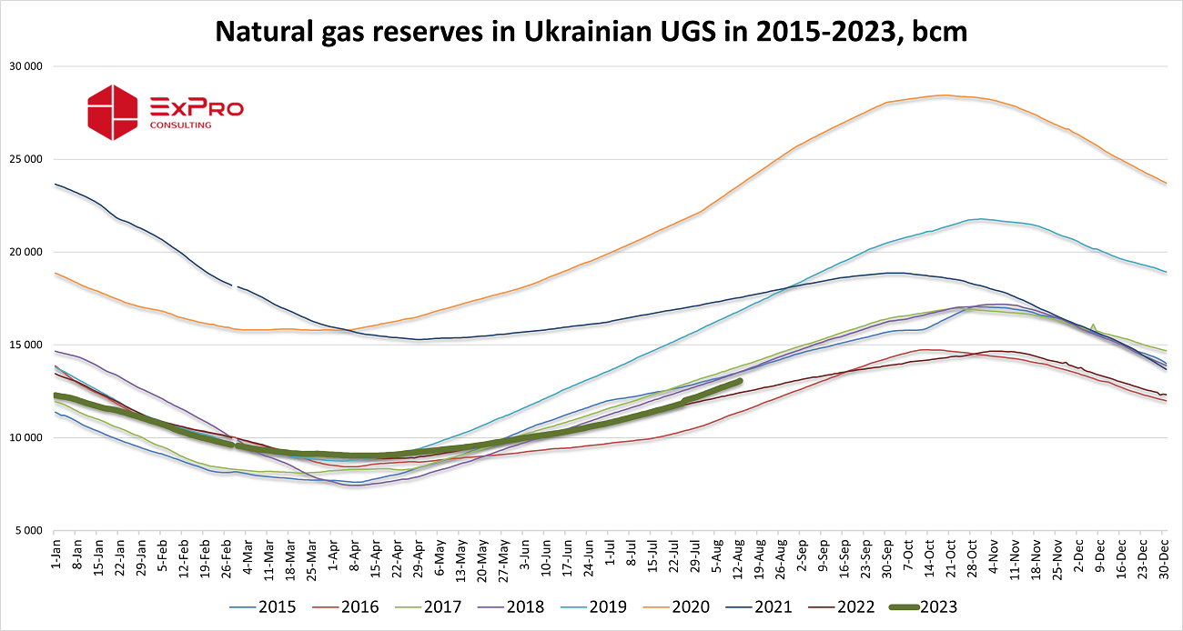 On August 13, natural gas reserves in Ukrainian underground gas storage facilities (UGS) amounted to almost 13.08 bcm, according to ExPro calculations, which confirm Naftogaz data. This is the total volume of gas in storage facilities, which includes both active gas and long-term storage gas. Thus, Ukrainian UGS are filled by 42%. Compared to last year, 5% or 650 mcm more gas is stored in storage facilities.