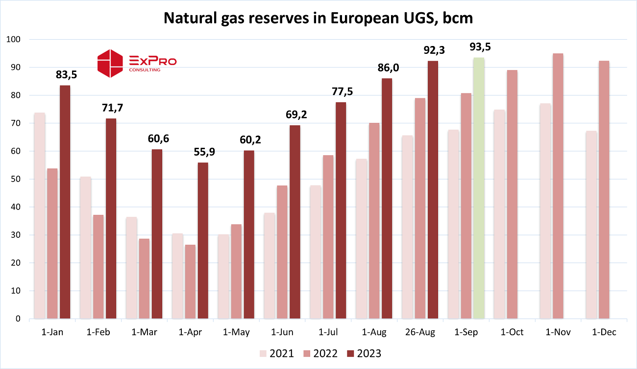 Europe has quite actively started preparations for the winter of 2023-2024, setting itself the goal of filling storage facilities by 90% by November 1, 2023. However, it was achieved on August 16, 2.5 months ahead of schedule. As of August 26, 99 bcm of natural gas were stored in European gas storage facilities, and storage facilities were 92.3% full. This is an all-time high for this date.