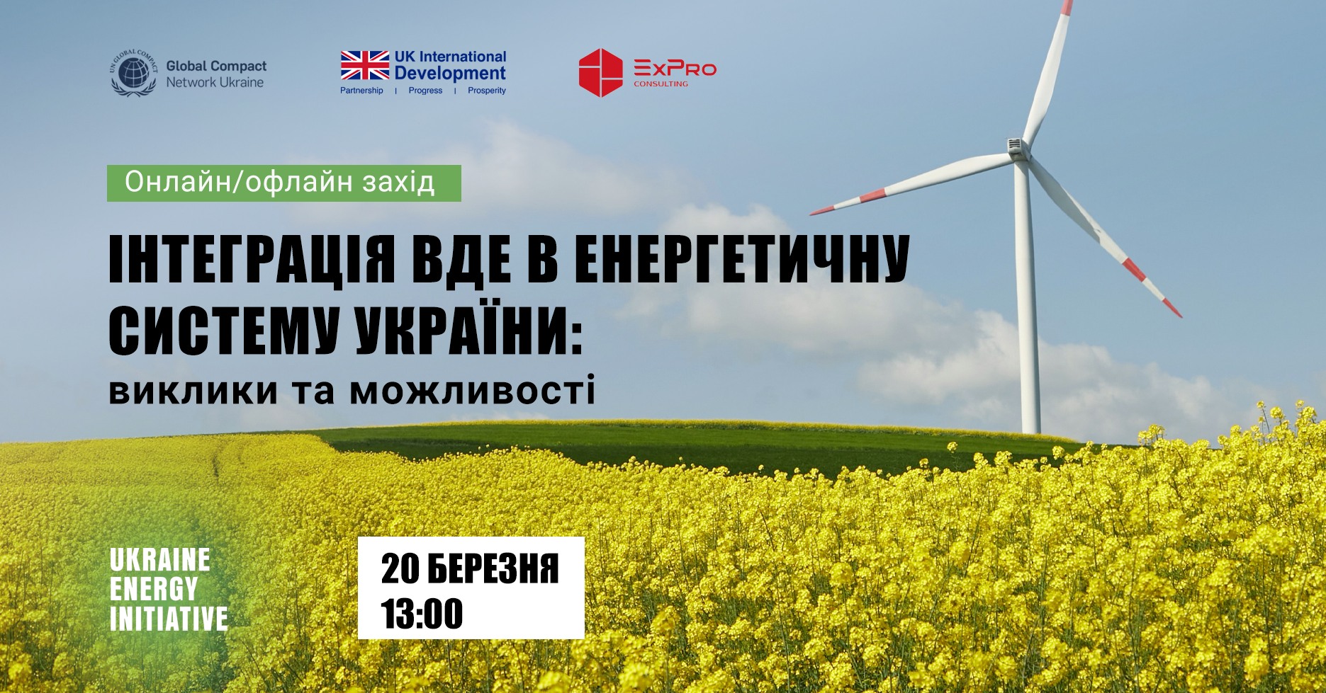 Запрошуємо на подію «Інтеграція ВДЕ в енергетичну систему України: виклики та можливості», яку організовує Глобальний договір ООН в Україні спільно з ExPro Consulting.