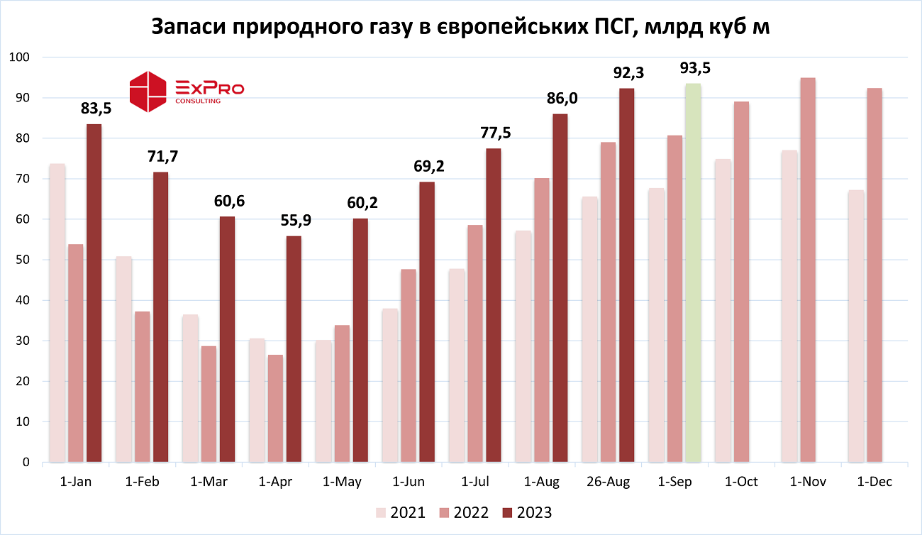 Європа досить активно почала підготовку до зими 2023-2024рр, поставивши собі за ціль заповнити сховища на 90% до 1 листопада 2023р. Однак, її вдалося досягти вже 16 серпня, на 2,5 місяці раніше плану. Станом на 26 серпня у європейських ПСГ було накопичено 99 млрд куб м природного газу, а сховища заповнені на 92,3%. Це історичний максимум на цю дату.
