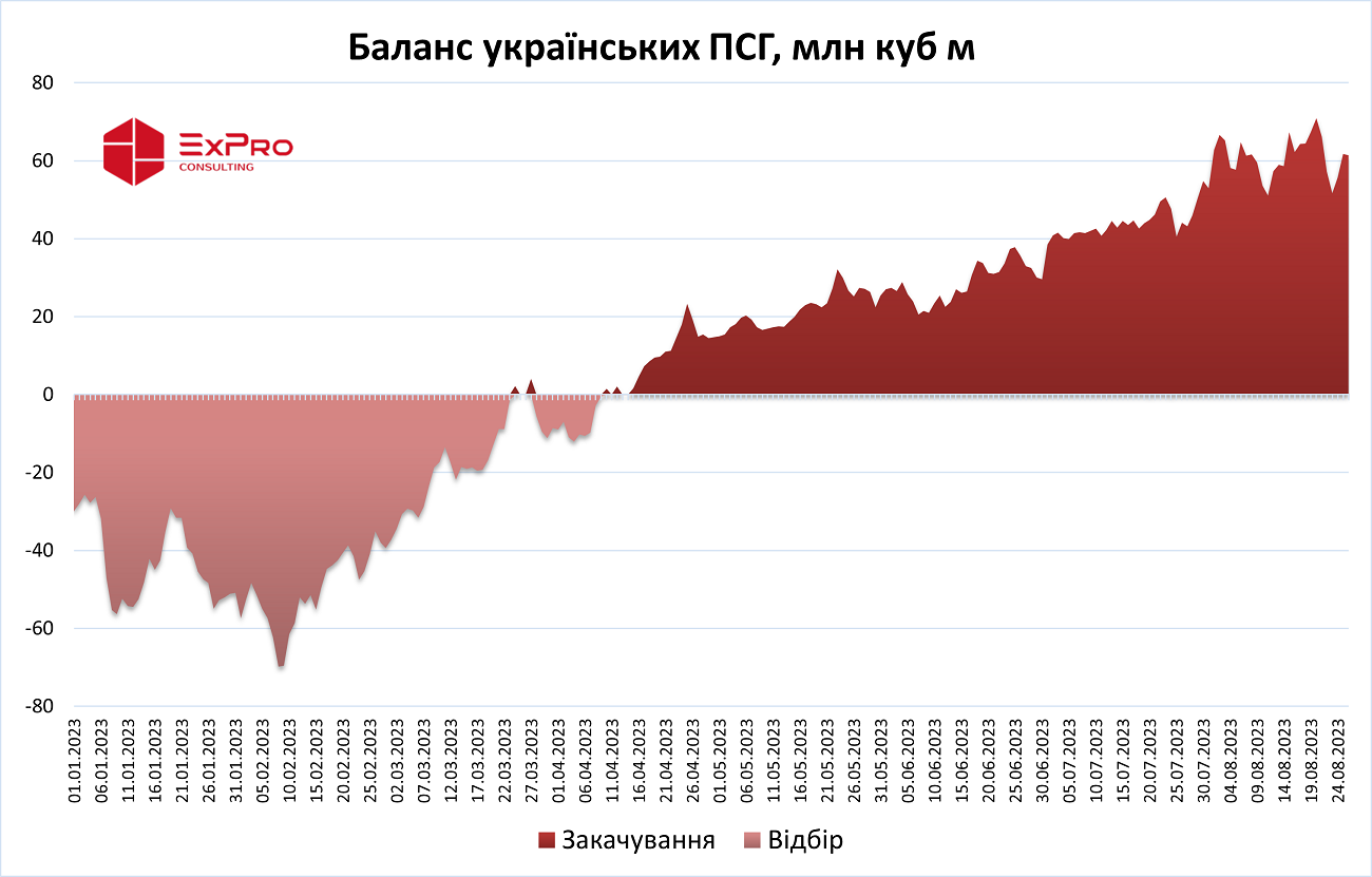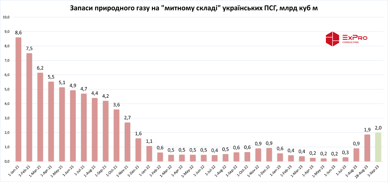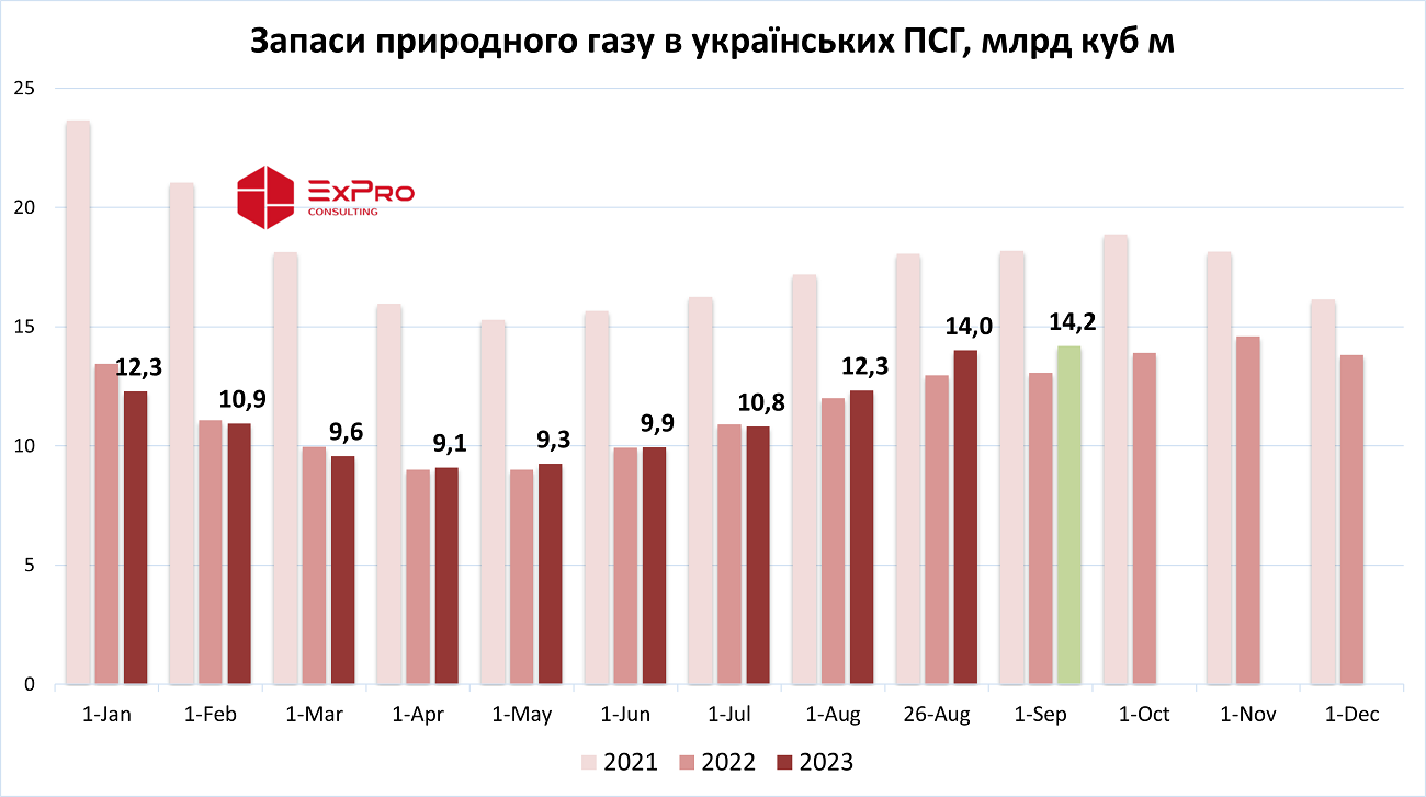 За прогнозами ExPro вже 1 вересня запаси газу на «митному складі» українських ПСГ можуть перевищити 2 млрд куб м. З початком вересня закачування газу до ПСГ України може зрости, оскільки європейські ПСГ продовжують наповнюватися. Однак, багато чого буде залежати від цін на природний газ на європейських хабах.