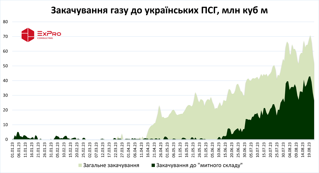 За 28 днів серпня до українських ПСГ було закачано понад 1,7 млрд куб м природного газу, з яких майже 1 млрд куб м - до «митного складу». Таким чином, більше половини газу, що закачується до ПСГ у серпні йде з-за кордону. З початку цьогорічного сезону закачування газу (15 квітня) до ПСГ України було закачано понад 4,8 млрд куб м природного газу.